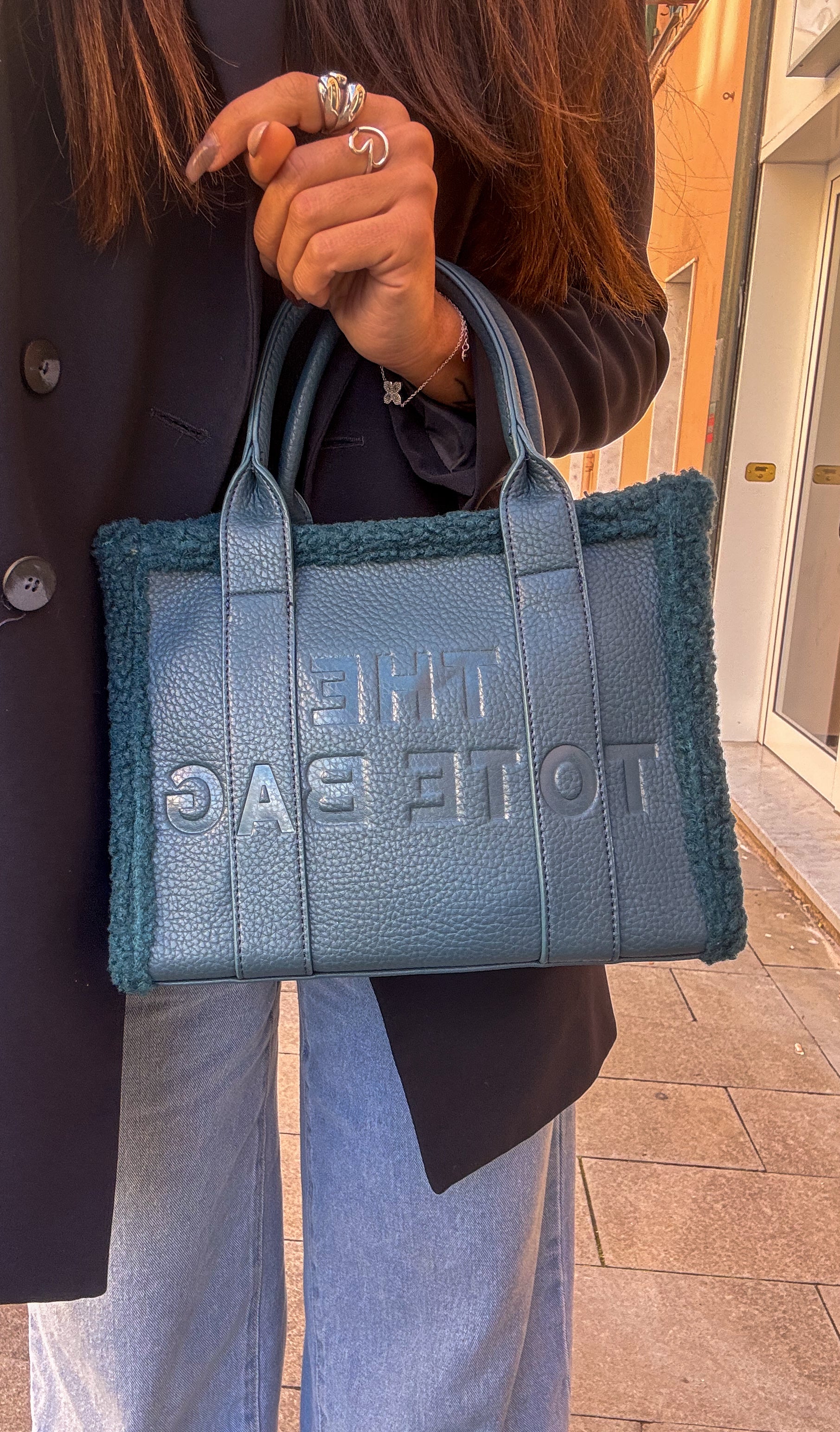 Borsa ToteBag in silmilpelle con zip di apertura grande, arricchita con bordino in pelliccia sintetica